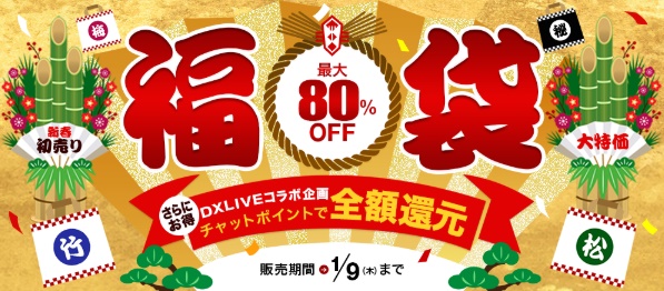 あ、ただ!1点だけ注意なんですが、DXLIVEのチャットポイントは1月23日に付与される予定なんで、福袋購入後すぐに貰えるわけじゃないって事だけ覚えておいてください!
