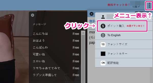まずは無料チャット(有料チャットでもOK)に入ります。そして、右上のメニューを表示してから『ポイント購入お得プランあり!』をクリックします。