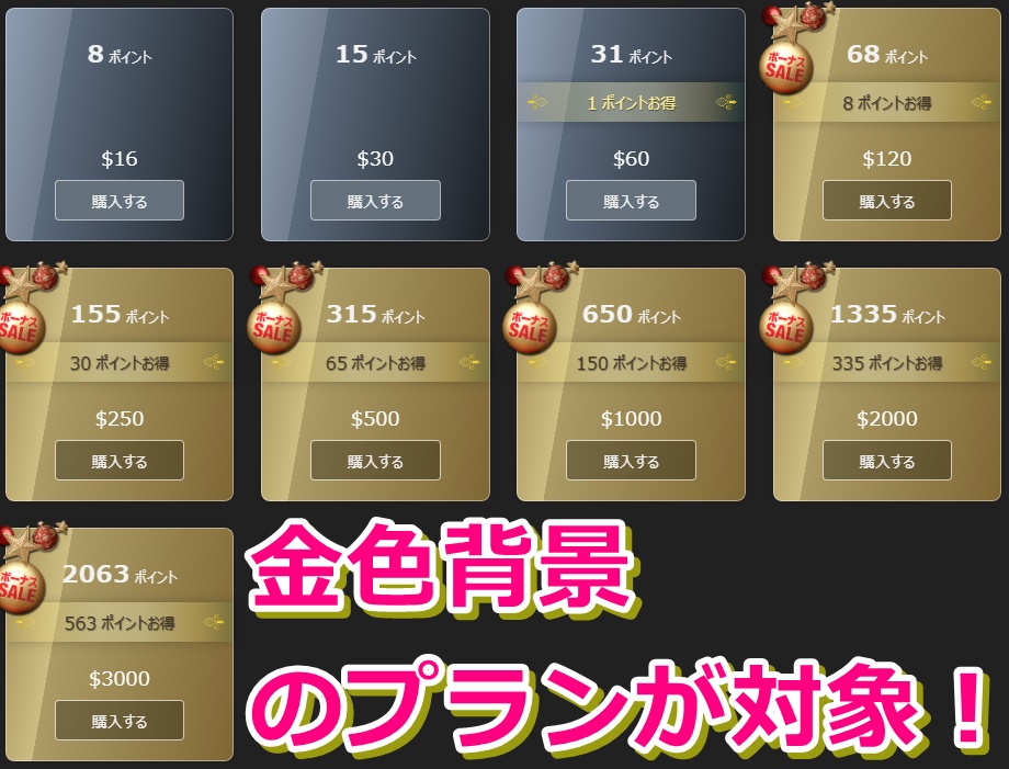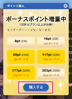 ただいま、チャット中にポイントを購入すると特定のプランに通常よりも多くのボーナスが付与されています!