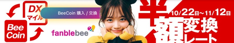 上記イベント期間中はFanblebee(ファンクラブ機能)内で使われるBeeCoinをDXマイルで交換する際に半額になります!