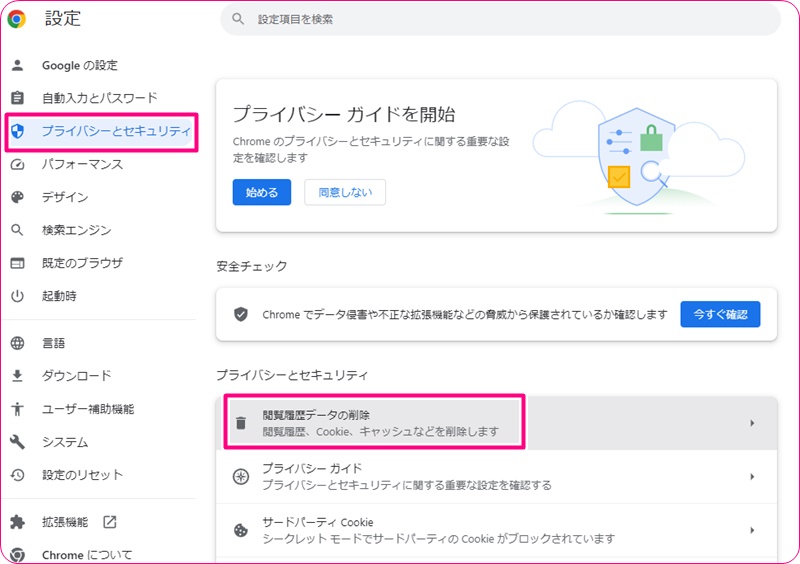 続けて、【プライバシーとセキュリティ】から【閲覧履歴データの削除】を押します。