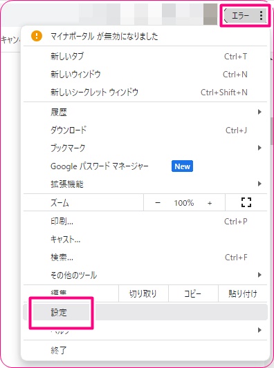 クッキーの削除方法はここでは詳しく解説はしませんが、例えばGoogleCromeであれば、まずメニューから設定を開きます。