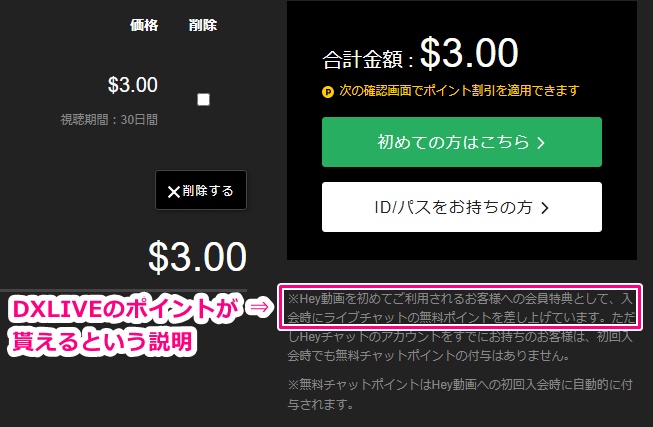 Hey動画で購入をする際にカート内を見てみるとDXLIVEのポイントが付与される事がちゃんと説明されていますので、付与されなかった場合はなんらかの不具合である可能性が高いです。