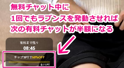 左下のメーターが最大まで貯まると無料チャットから有料チャットへ移行した時にチャット料金が50%割引になる恩恵を得る事が出来るので、有料チャットまで楽しみたい場合にはラブンスを発動させてしまってメーターMAXにしてしまった方がコスパ的にも良かったりします。