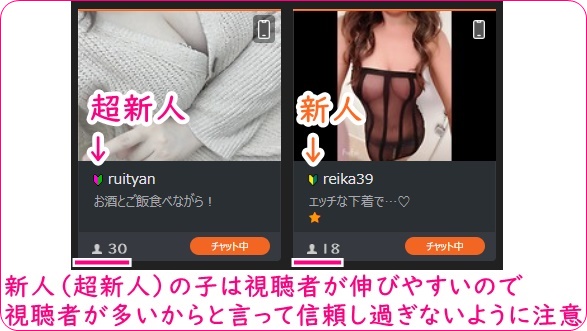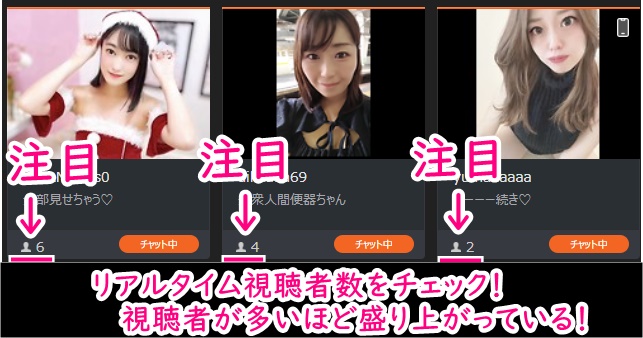 たまに瞬間的に視聴者が伸びる女の子がいます。例えば50人〜100人程度の視聴者がいる場合です。こういった子にはすぐに入室せずに数十秒待ってみる事も必要です。なぜならその子は、もしかすると無料チャットから通常のチャットへ移行した瞬間であった可能性があるため、30秒〜1分ほど待ってみると一気に視聴者数が大幅に下がる場合があります。