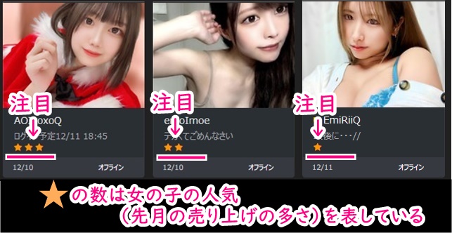 逆に新人なのに★がついてるような子には期待できます。デビューしたばかりの短期間に★を貰えるほど稼ぐ事ができるという事は、たぐいまれなるチャットレディのセンスがあるか、DXLIVE以外のライブチャットサイトで既に働いていた経験があるような慣れている子の可能性が高いです。