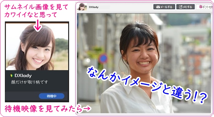 DXLIVEプロはサムネイル画像だけで判断せずに必ず待機映像も確認します。今時は画像を加工して可愛く見せるアプリとかソフトが沢山ありますので、サムネイル画像と実際の姿が大きく違う場合があります。