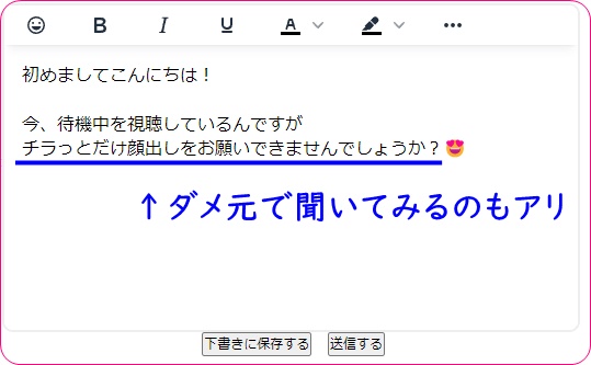 ただ、女の子が必ずしもメールを見てくれるわけではありませんし、待機中には顔出しをしないと決めている子もいるので、そこまで有効な手段ではありませんが、参考程度に覚えておきましょう。