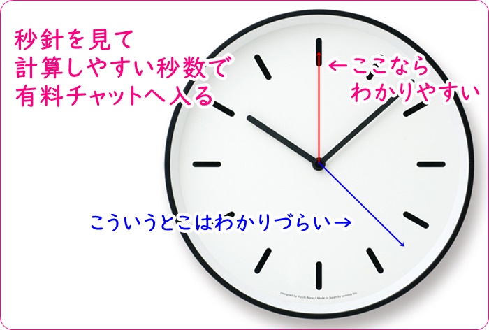 有料チャットは30秒ごとにポイントが消費されていき、残りポイント数もリアルタイムに減っていきます。出来るだけポイントを節約したいのであれば、目の前に秒がわかる時計を置いておいて、有料チャット中の秒数を把握しておいた方が良いでしょう。