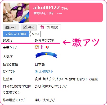 自己紹介文にあまり目を通さないかたも多いかと思いますが、DXLIVEプロはここにも目を光らせます。だいたいエッチな子というのは自己紹介文を見ればわかります。言葉の端々に欲求不満な雰囲気がにじみ出ています。