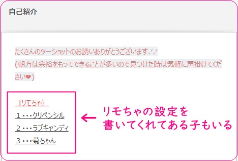 何番がどのリモちゃに繋がっているのか?というのは女の子の自己紹介文で説明されている事も多いので、リモちゃが好きなかたは自己紹介文の方にも目を通しておくと良いですね。