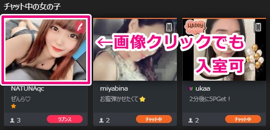 また、サムネイル画像一覧で『チャット中』の女の子の画像をクリックする事でも有料チャットへ入室できます。