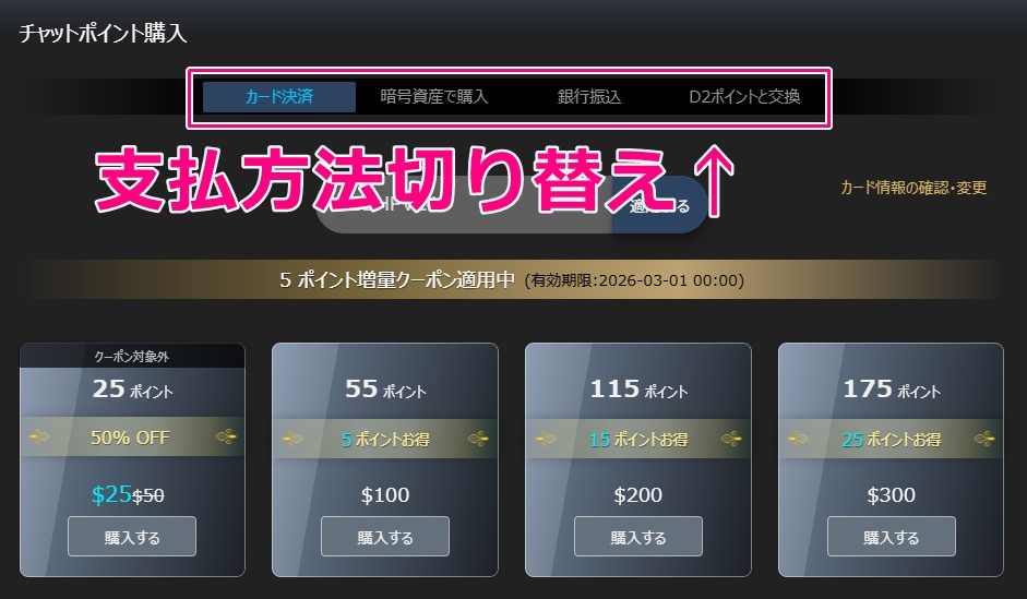 ポイント購入ページでは、クレジットカード、デビットカード、銀行振込、仮想通貨など利用可能な支払い方法が一覧で表示されます。自分に合った支払い方法を選択し、必要な情報を入力します。