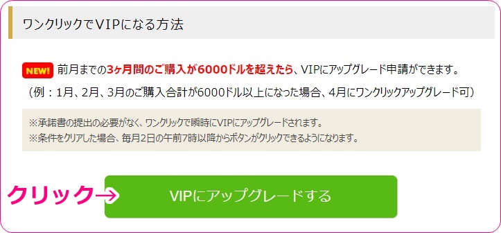 例えば1月2月3月の合計購入額が6000ドルを超えた場合、4月2日の7時にワンクリックVIPのボタンが解放されます。6000ドル分のポイントを購入した時点で開放されるわけではないので翌月まで焦らずちょっと待ちましょう。