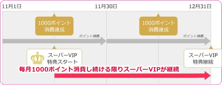 いつ、どのタイミングで1000ポイント消費を達成したとしても翌月末まではスーパーVIP会員が継続されますので、最低でも1ヶ月間はかならずスーパーVIPでいられるのですが、スーパーVIP会員になった月の翌月のあいだに追撃で1000ポイントを消費しないと、翌月末にはスーパーVIP会員が終了してしまいます。