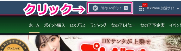 DXLIVEのトップページの一番上の方に【所有D2ポイント】と書かれたところがありますのでクリックをしましょう。