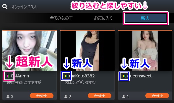 新人の女の子には専用のアイコンがついていますのでわかりやすいです。新人と超新人はアイコンの色が違うので気を付けましょう。超新人はDXLIVEに登録してから2週間以内という非常に短い期間の女の子が対象になります。