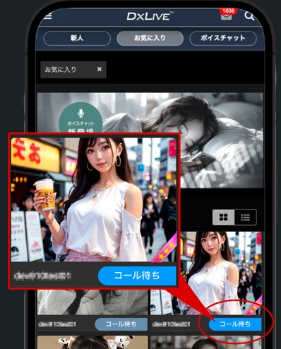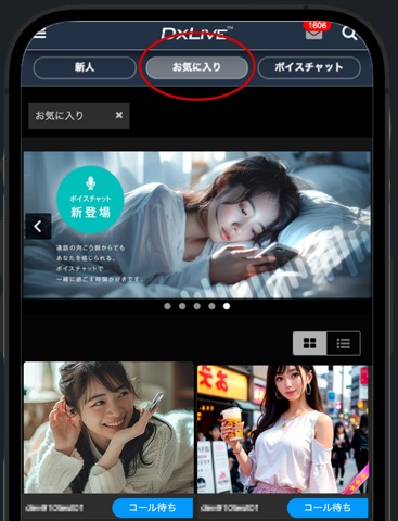 コール待ちの女の子は自分がお気に入り登録をしていないと表示されないので、お気に入り登録を全くしていないという場合は、まずお気に入り登録をするところから始めましょう。