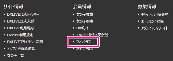 DXLIVE(パソコン版)をページ下部までスクロールして頂くと『ファンクラブ』という部分がありますのでそちらをクリックしてみて下さい。