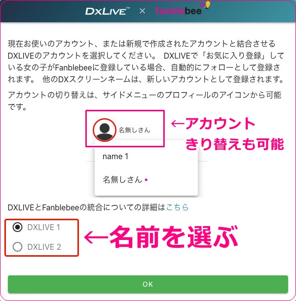 DXLIVEの会員登録情報でfanblebeeにログインした場合はDXLIVEとfanblebeeが連動しますので、例えばDXLIVEで女の子をお気に入り登録をするとfanblebeeでも同じ女の子を自動的にフォローしますし、逆にfanblebeeからフォローをした場合も勝手にお気に入り登録がされます。
