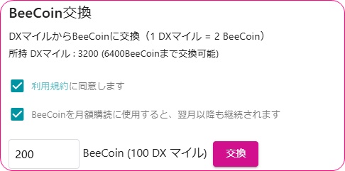 100マイルで200BEECOINに交換する事が出来まして、どれだけのBEECOINが欲しいかは細かく自由に設定する事が出来ます。例えば201BEECOIN分を交換するという事も可能ですが、DXLIVEで保有しているマイル以上に交換する事は出来ません。