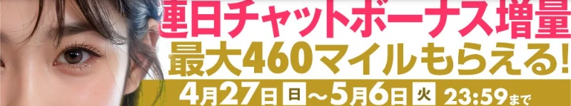 ゴールデンウィークに合わせたキャンペーンが始まりました!上記期間中に毎日チャットをすると、ボーナスマイルの量が2倍になります!